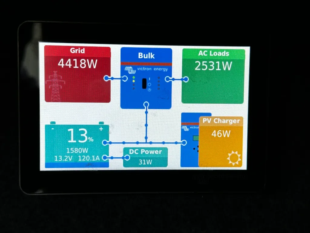 Our RV AC Load is currently 2531 watts. The grid is providing 4418 watts of power, and the remaining load is recharging our battery system.