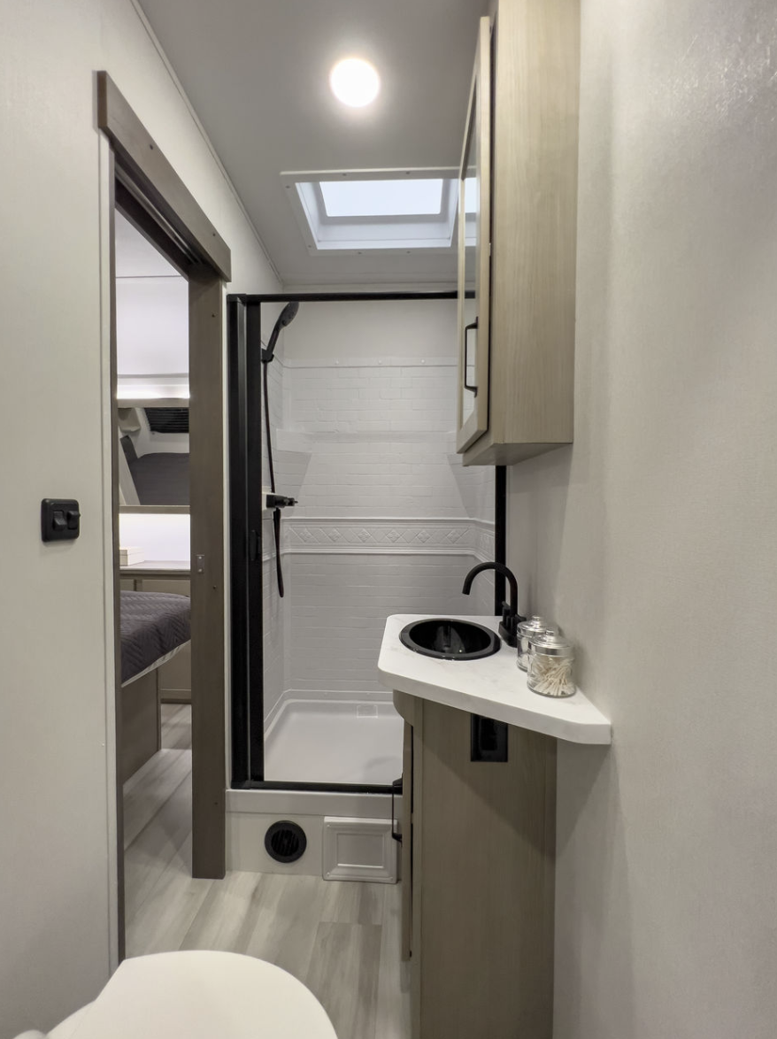 The bathrooms are surprisingly spacious, featuring full-size showers with skylights, residential-style fixtures, and enough elbow room to move comfortably. It’s a small luxury that makes a big difference after a day spent outdoors.