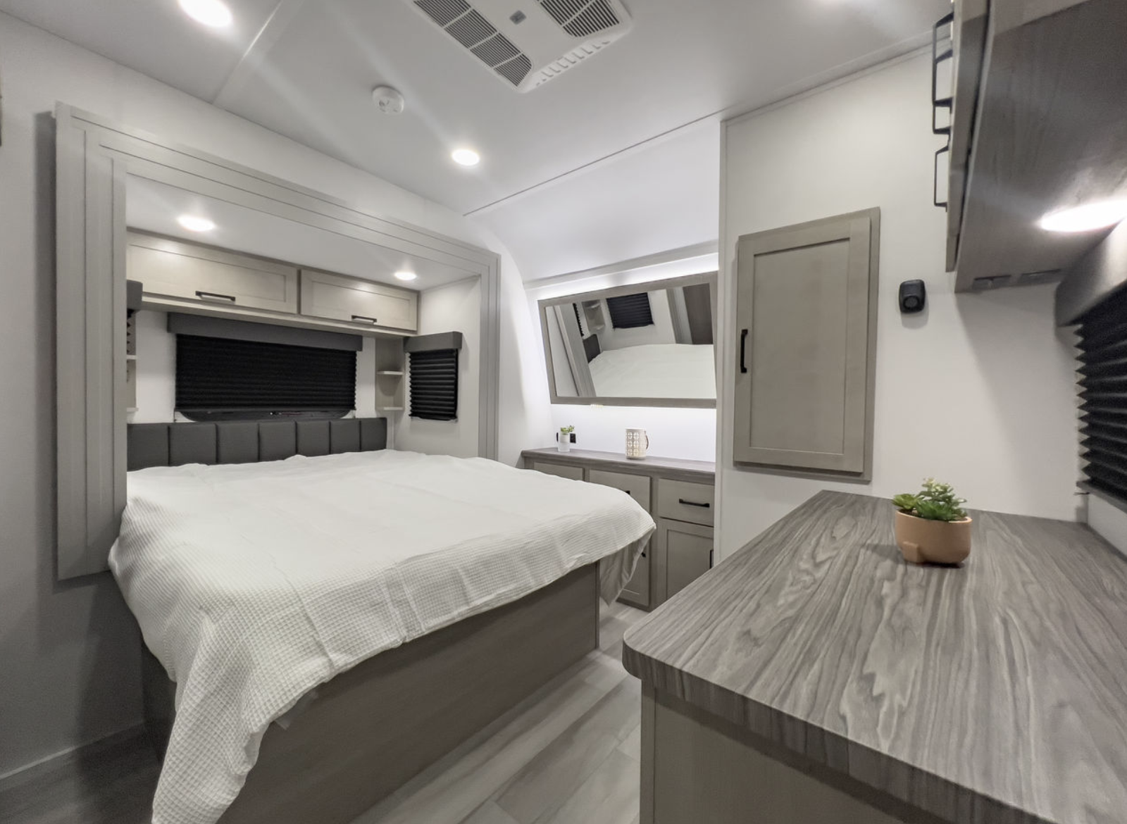 When it comes time to rest, the Momentum G Class doesn’t skimp on comfort. The master bedroom boasts a queen-size bed with a plush mattress, surrounded by thoughtful storage solutions like overhead cabinets and bedside wardrobes.